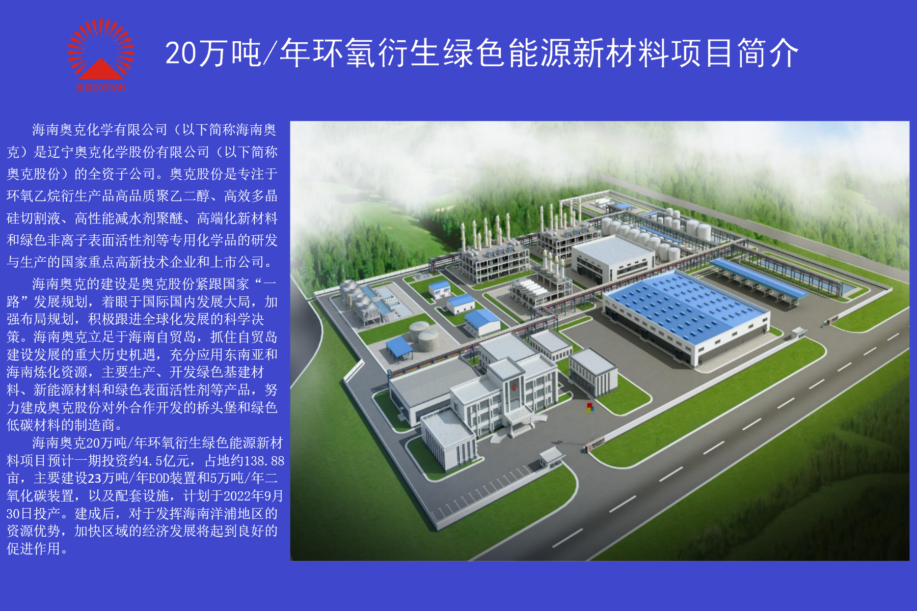 海南奧克是奧克股份在全國(guó)五大區(qū)域的拓展,前期在洋浦經(jīng)濟(jì)開(kāi)發(fā)區(qū)工委管委會(huì)、中國(guó)石化海南煉化公司、中石化化工銷售(海南)公司和洋浦國(guó)際等的大力支持下,于2021年2月5日注冊(cè)成立,注冊(cè)資本11,520萬(wàn)元,占地面積約140畝,擬投資4.5億元,主要建設(shè)23萬(wàn)噸/年EOD裝置以及配套設(shè)施,預(yù)計(jì)于2022年9月30日建成投產(chǎn),主要生產(chǎn)、開(kāi)發(fā)綠色基建材料、新能源材料和綠色表面活性劑等產(chǎn)品。該項(xiàng)目的投資建設(shè),是奧克股份堅(jiān)持“立足環(huán)氧乙烯創(chuàng)造價(jià)值”,滿足華南、海外東南亞不斷擴(kuò)大市場(chǎng)的戰(zhàn)略需要;是奧克股份依托中石化海南煉化公司環(huán)氧乙烷原料優(yōu)勢(shì)資源,為奧克快速發(fā)展和海南地方經(jīng)濟(jì)做出貢獻(xiàn)的戰(zhàn)略需要;也是完善奧克的市場(chǎng)營(yíng)銷網(wǎng)絡(luò)體系,打通現(xiàn)有區(qū)位空間格局,共同釋放協(xié)同效應(yīng),提升奧克在華南、海外等境內(nèi)外的市場(chǎng)份額的戰(zhàn)略需要;更是面向奧克“十四五”規(guī)劃及2035遠(yuǎn)景目標(biāo),邁向現(xiàn)代化、國(guó)際化發(fā)展的戰(zhàn)略需要。